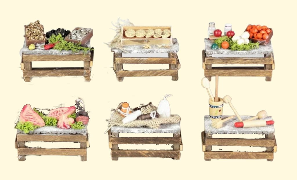 (10718) Stoliki na bazar z drewna, 6 różne, 9,5x6,5cm